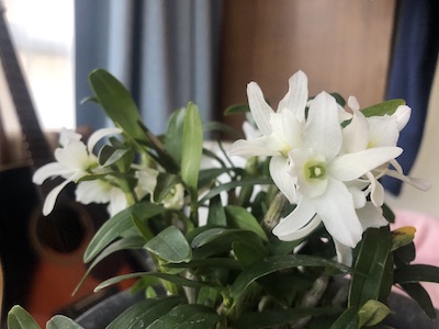 雪にも負けず、花壇に植えた花は、今日も元気に咲いていてくれました。日中は外、日が照らない時は家の中にいるデンドロビウムもたくさんの花を咲かせてくれています。