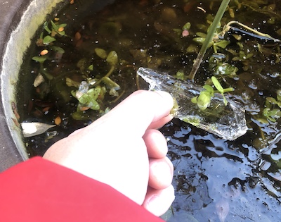 で、その寒さで、今期初の睡蓮鉢全面結氷がきました。