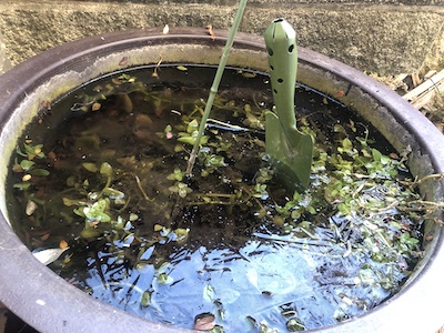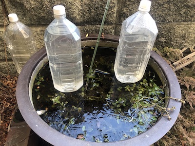 水満タンのペットボトルを2本置いてもびくともしない。設置してからもう優に10年以上は経つのかな?底の泥も溜まってきたことですし、暖かくなってきたら一度ざざっと泥をすくって、またメダカや他の生き物が住める環境にしたいものです。現在の状態だと、夏はすぐにゆだるし、冬はこのように凍るので、生き物入れたら即死です。